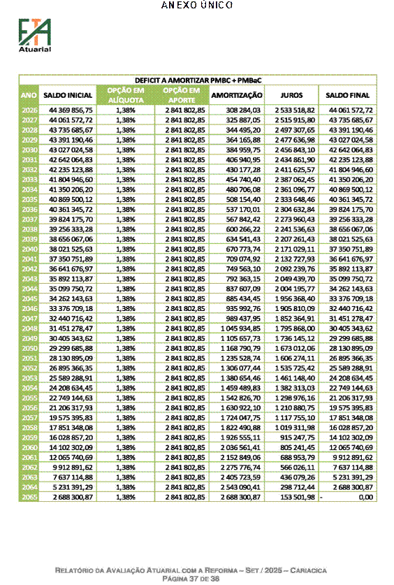 Art. 4º O Poder Executivo Municipal, a fim de alcançar o equilíbrio atuarial, realizará a amortização do déficit técnico atuarial em 43 (quarenta e três) anos, conforme projeção de amortização da avaliação atuarial realizada por atuário, constante no Anexo Único desta Lei.